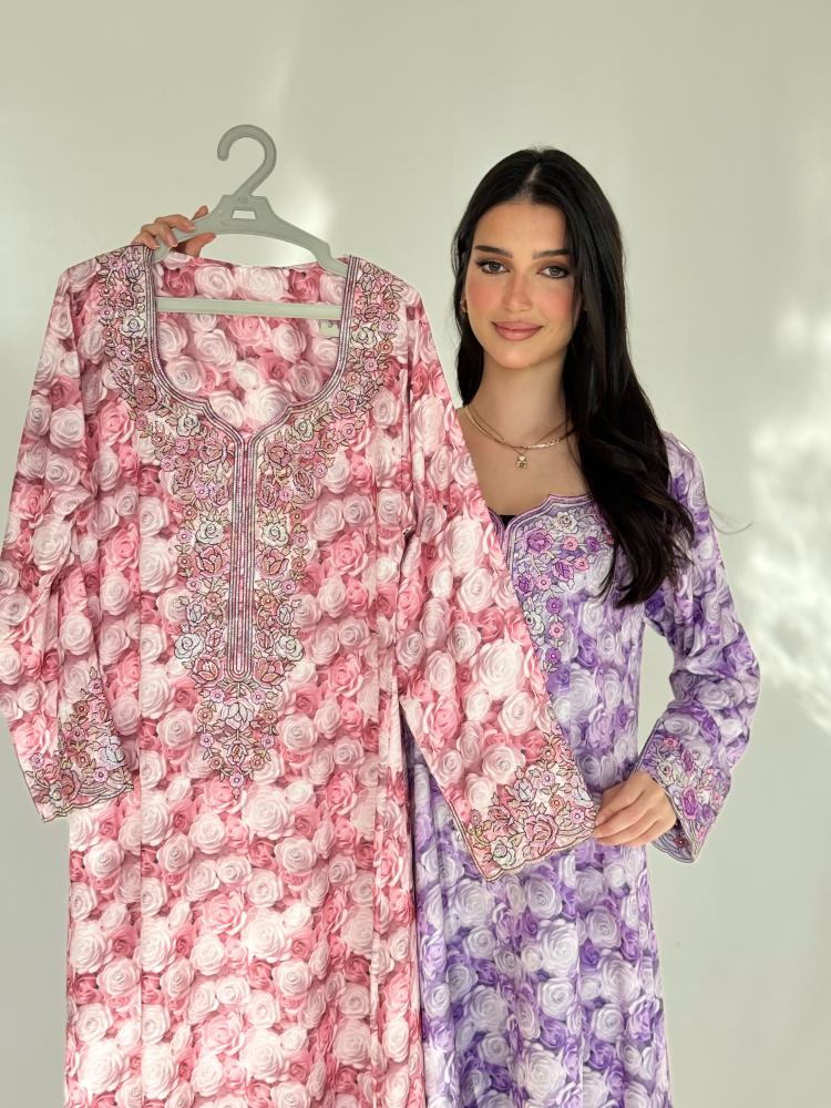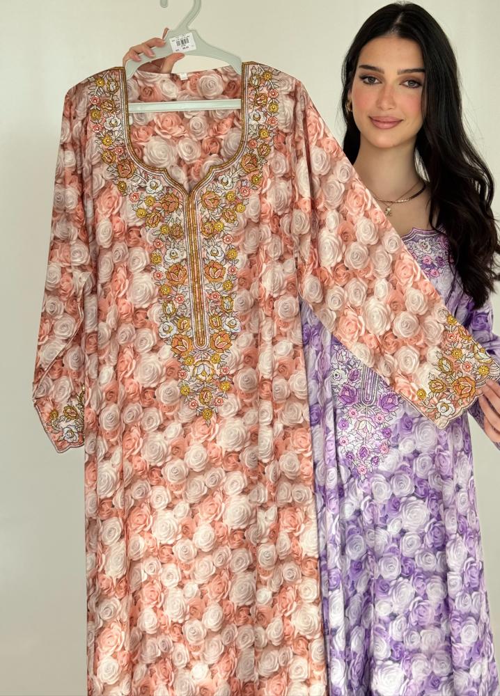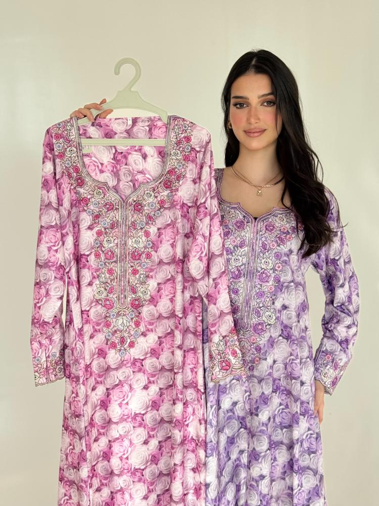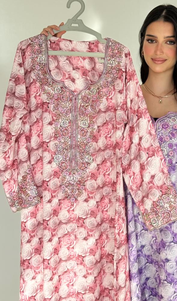 تميّزي بإطلالة ناعمة وراقية مع جلابيات ومخاوير نسائية بطبعة ورود أنثوية ولمسات تطريز فاخرة على الصدر والأكمام 🌸