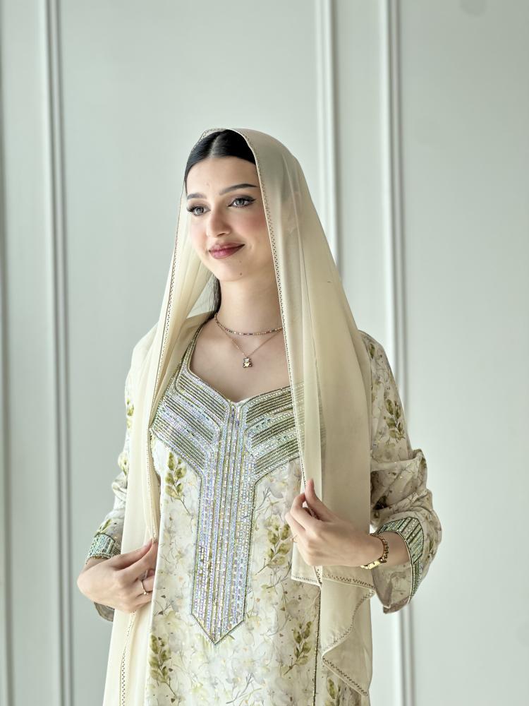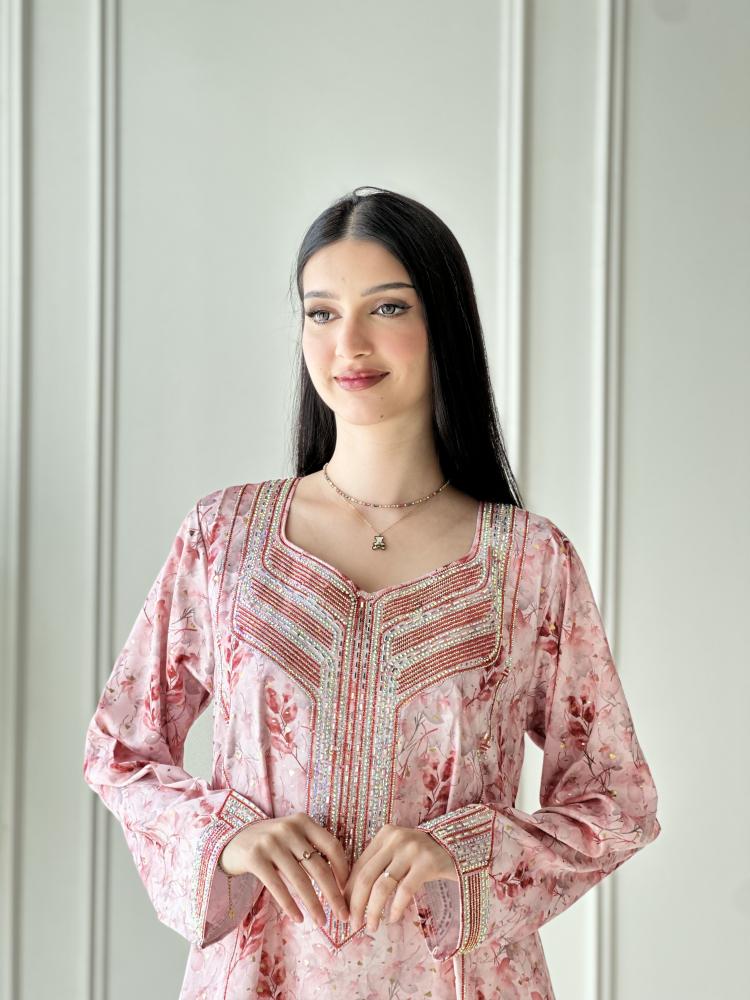 تميزي بإطلالة فخمة وناعمة مع جلابية ومخور بتصميم راقٍ وفخم، قماش حرير بارد بنقشة ورود ناعمة وتطريز فاخر عند الصدر والأكمام يضيف لمسة ملكية لإطلالتك.